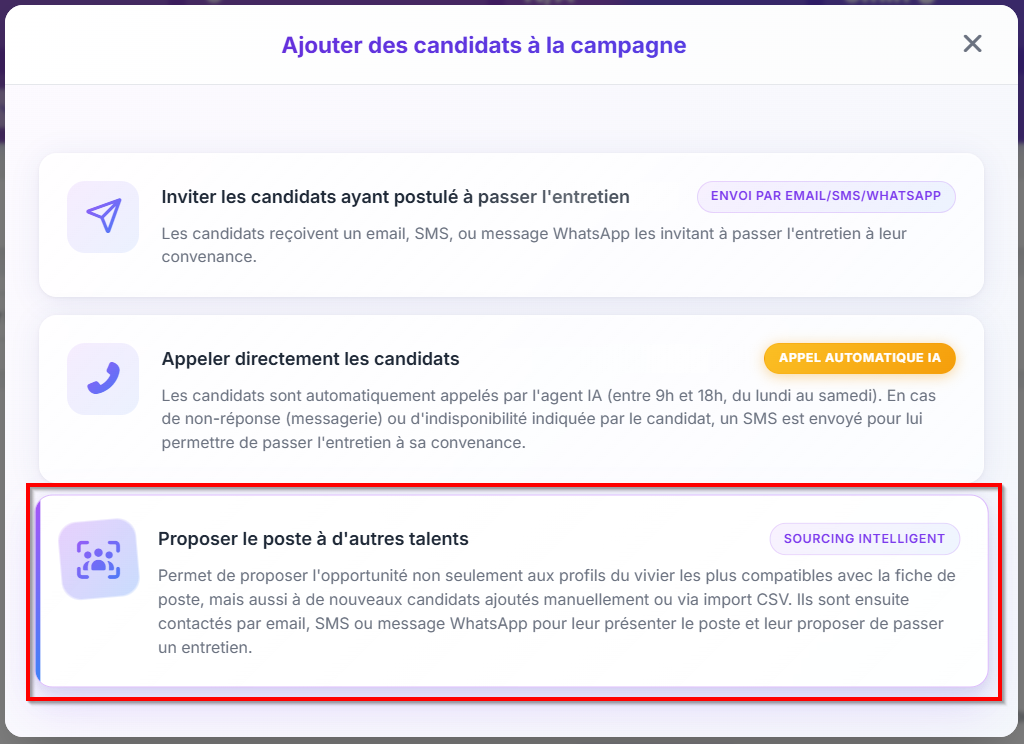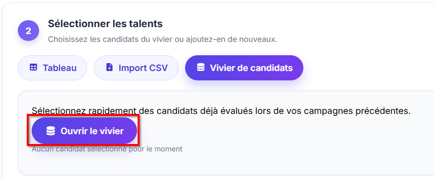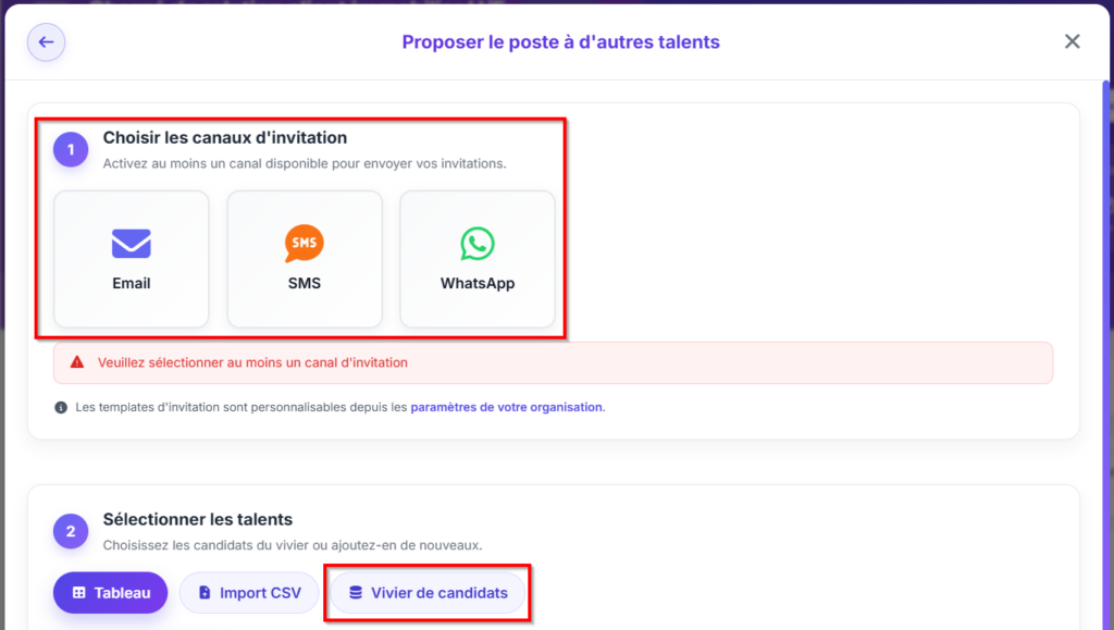 Sélectionnez le canal ou les canaux d’invitation (Email, SMS, WhatsApp), puis cliquez sur le bouton « Vivier de candidats » :