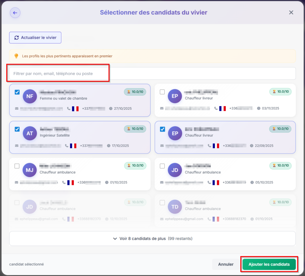 Lancez votre recherche, sélectionnez les candidats à qui vous souhaitez proposer l’entretien, puis cliquez sur le bouton « Ajouter les candidats » :