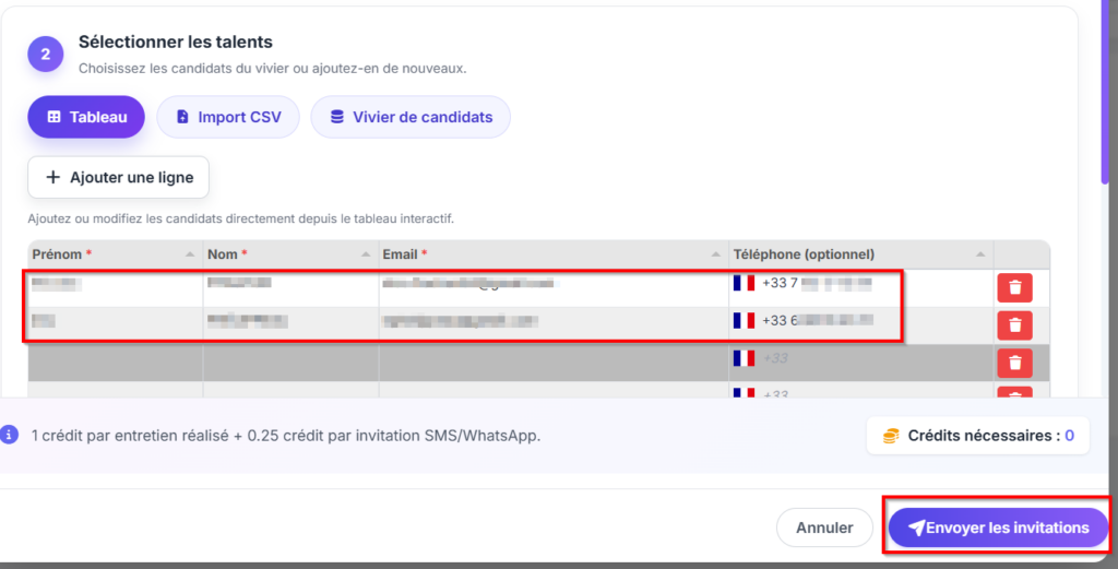 Les données relatives aux candidats apparaissent. Cliquer sur le bouton « Envoyer les invitations » pour faire partir les messages :