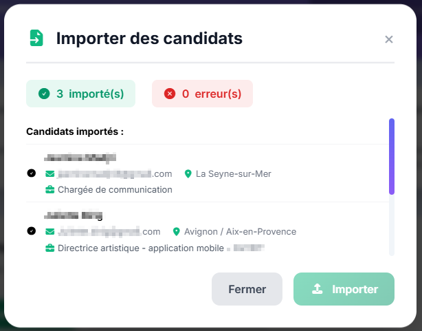 Depuis le vivier, les candidats importés se distinguent par l’affichage d’un encart précisant « Importé depuis CV : JJ/MM/AAAA) :